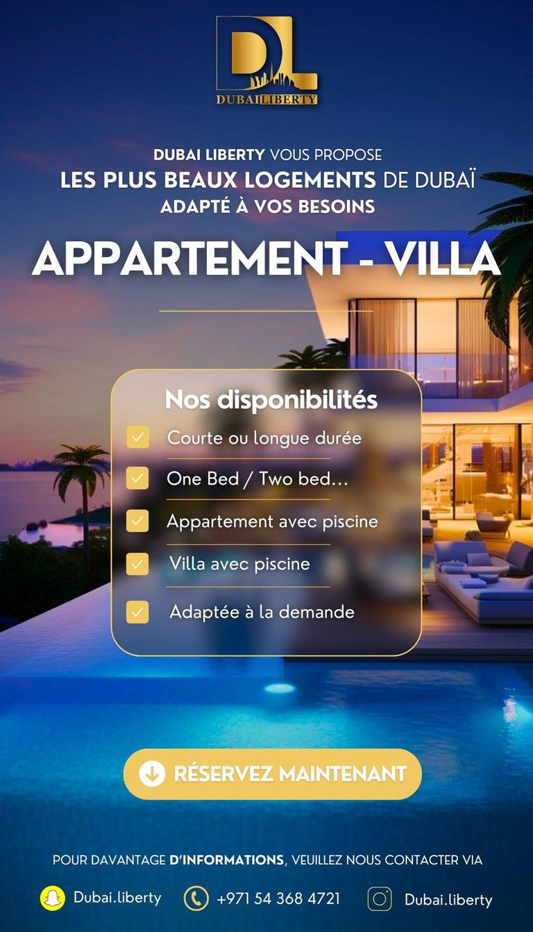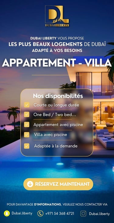 Dubai Liberty vous offre une sélection exclusive d'appartements et de villas de luxe à Dubaï, pour un séjour inoubliable dans cette ville emblématique. Que vous veniez en famille, entre amis, pour affaires ou pour une escapade romantique, nous avons des options d'hébergement adaptées à tous vos besoins.