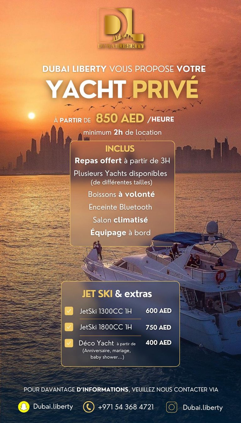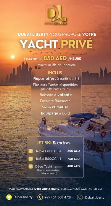 Offrez-vous une expérience inoubliable en explorant les eaux cristallines de Dubaï à bord de notre yacht privé. Que ce soit pour une journée de détente en mer, un événement spécial ou une soirée élégante, nous mettons à votre disposition des yachts luxueux parfaitement équipés pour répondre à toutes vos attentes. Profitez de services personnalisés, d'une vue imprenable sur la côte de Dubaï et d'un confort incomparable. Réservez dès aujourd'hui et vivez le luxe sur l'eau !